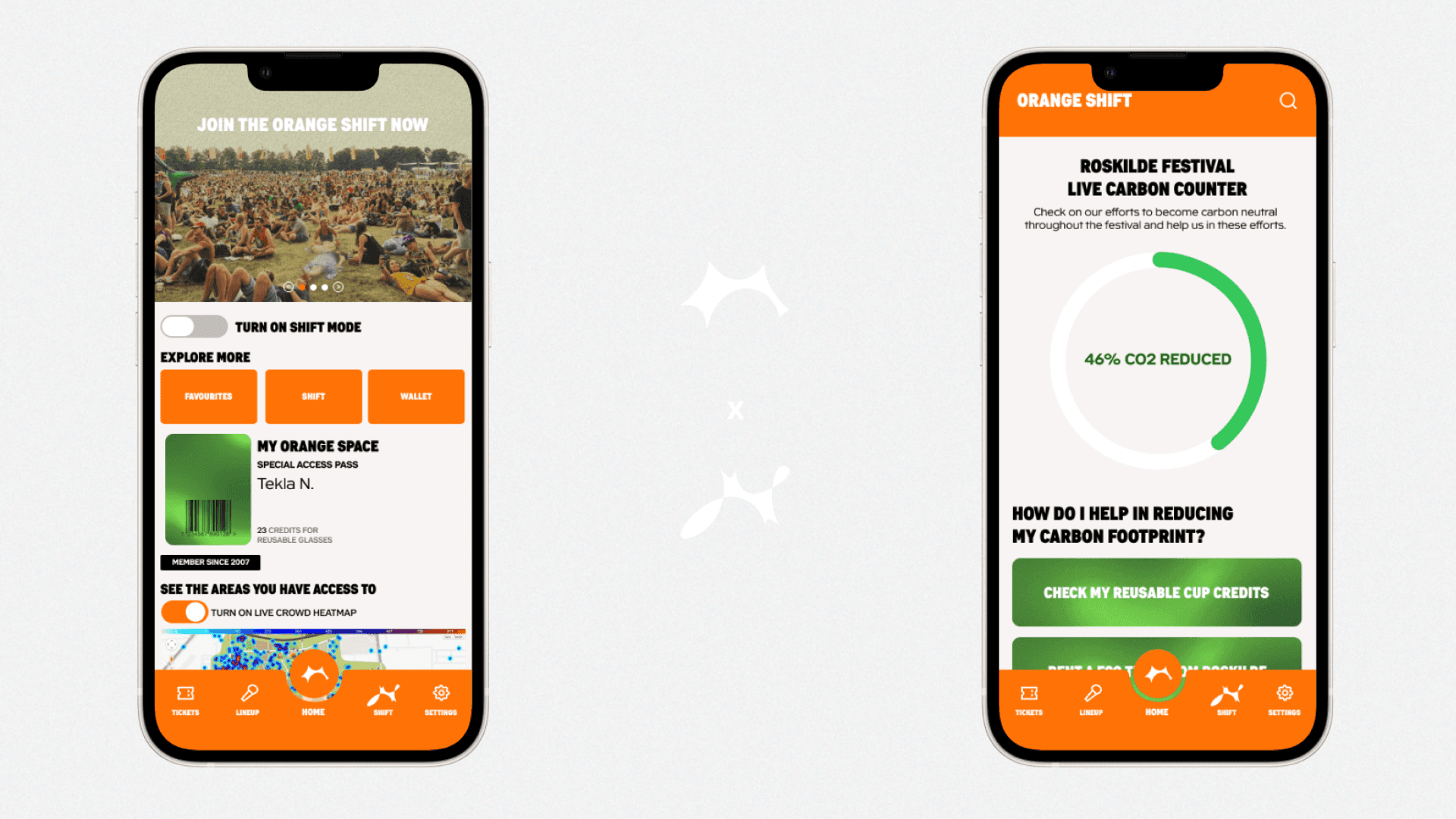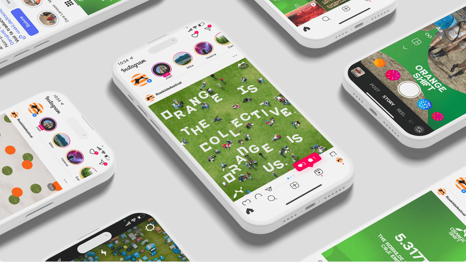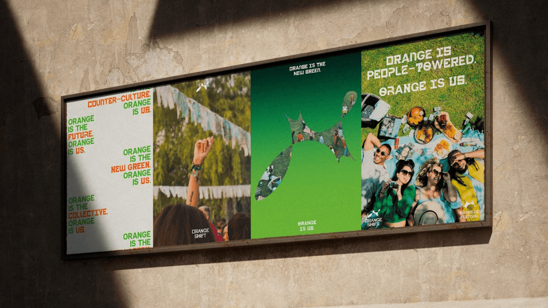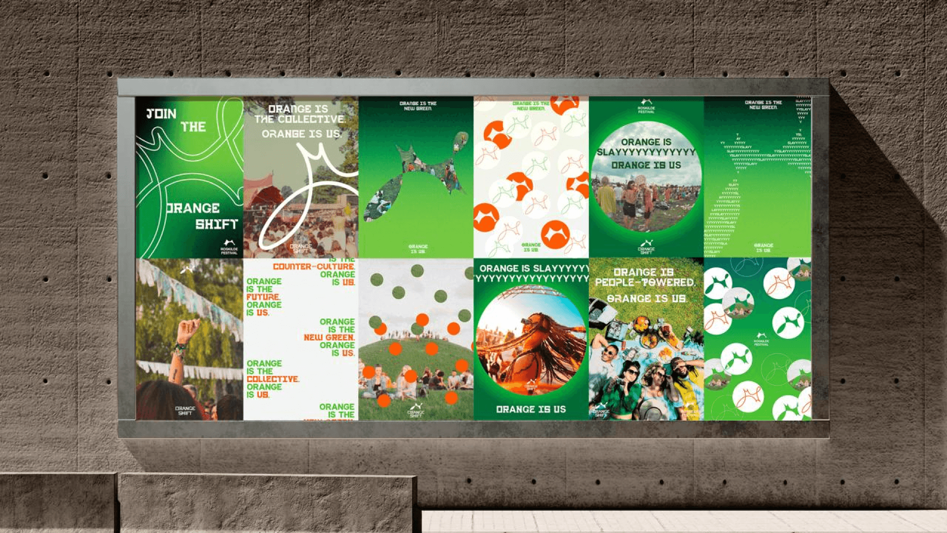 The Orange Shift is a campaign designed to help Roskilde Festival become carbon neutral by 2028. Using custom typography created by our team, we created a campaign that integrates seamlessly into the festival to allow the visitors help RF achieve their goal. The campaign consists of a number of marketing touchpoints, physical wayfinding and scenography, website and app additions while keeping the essence of Roskilde Festival consistent.